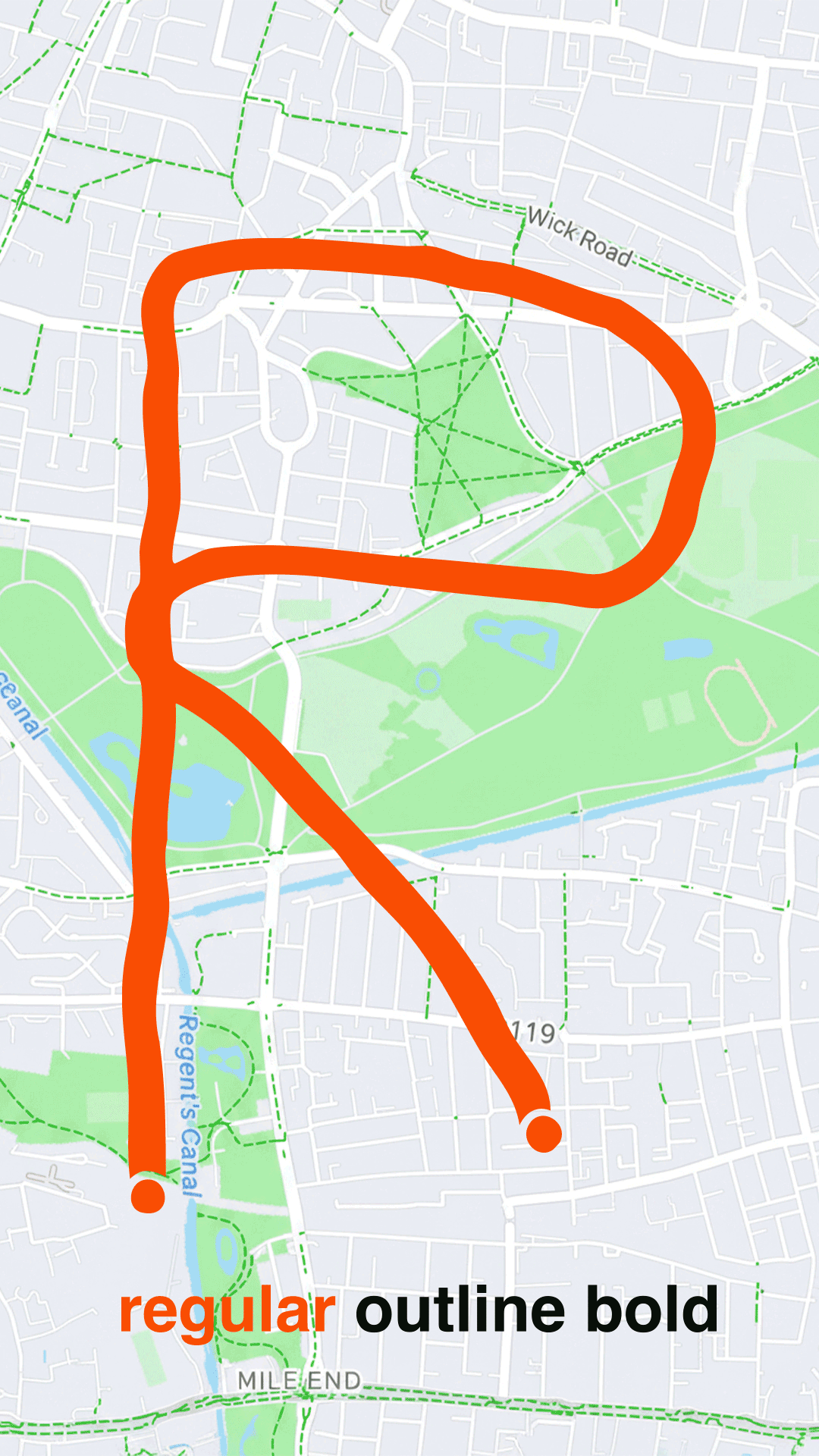 I ran 26+ times and used the Strava’s feature “fly over” to generate letters and create Kudos Grotesque.